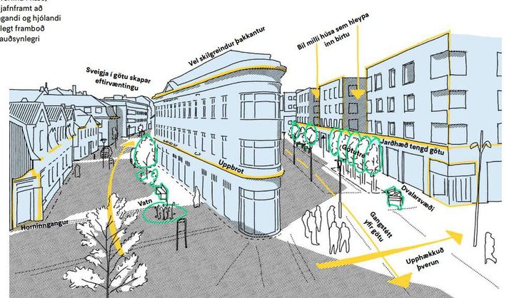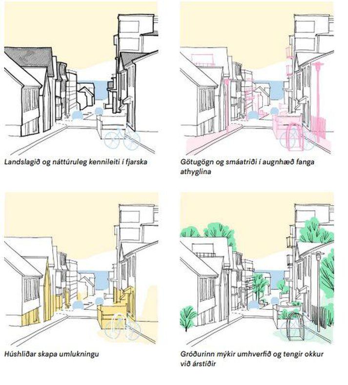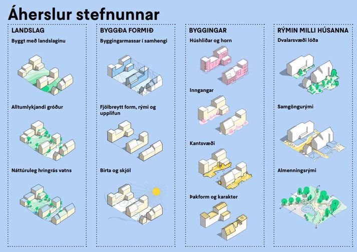 „Þessi stefna er fyrir alla, bæði fagfólk og þau sem eru að standa að uppbyggingu, arkitekta, hönnuði og uppbyggingaraðila. En þetta er líka fyrir almenning. Þetta er svona ákveðið loforð um það sem við viljum að íbúar geti búist við í uppbyggingu og í þróun borgarinnar,“ segir Dóra Björt um borgarhönnunarstefnuna sem er í samráði til næsta miðvikudags, 23. október og verður til umræðu hjá borgarstjórn í vikunni. Hún segir stefnuna virka bæði inn og út á við. Hún eigi að virka sem rammi í kringum gæðin sem borgaryfirvöld vilji að borgin geti boðið upp á. „Við erum að þétta byggð og við erum að tryggja hagkvæma nýtingu lands, í takt við alþjóðlega þróun. En það er ekki sama hvernig það er gert og út á það gengur þessi stefna. Að tryggja gæðin, að tryggja að uppbygging sé á forsendum íbúanna, taki mið af velferð þeirra og að borgin sé hönnuð út frá þeirra mælikvarða þannig að þeir upplifi borgina á jákvæðan hátt.“ Áherslur stefnunnar í nokkrum myndum. Reykjavíkurborg Dóra Björt segir margt hafi verið gert vel síðustu ár en inn á milli séu dæmi sem sýni að það sé alltaf tilfellið og þessi stefna eigi að vera svar við því. Stefnan setji skýrari kröfur og viðmið um hvernig uppbygging eigi að vera. „Svo það sé ekki háð einstaka verkefnastjórum eða einstaka deiliskipulagi hvernig niðurstaðan verður. Heldur að þetta sé stefna á stærri skala sem kveður á um öll þessi smáatriði sem hafa svo mikil áhrif. Umræðan á öðru plani í dag Í aðalskipulagi sé stóra sýnin og þar sé fjallað um grænt og manneskjuvænt umhverfi en í þessari stefnu sé þessi stóra sýn tekin og innleidd í þetta smáa í umhverfinu sem skiptir miklu máli í hversdegi fólks Til dæmis er í stefnunni fjallað um húshliðar, skjól og birtu, hvernig borgin lítur út í augnhæð, tegund svala og innganga og þakform. Mynd úr stefnunni þar sem fjallað er um byggingar og rýmið í kringum þær. Reykjavíkurborg Dóra Björt hefur beitt sér fyrir því að þessi stefna verði mótuð allt frá síðasta kjörtímabili og segir umræðuna um húsnæðismál hafa tekið stakkaskiptum á þessum stutta tíma. „Þá var umræðan um húsnæðismál ekki komin á þann stað sem hún er í dag. Það var ákveðin mantra um hraða og magn allsráðandi á þeim tíma. Það var talað um húsnæðiskreppu og að það þyrfti að byggja meira, sem er sannarlega staðan, en það er ekki sama hvernig það er gert.“ Hún segist hafa reynt að vekja máls á þessu í síðustu kosningabaráttu við litlar undirtektir og takmarkaðan áhuga fólks. Það hefði ekkert annað komist að í umræðu nema hversu hratt ætti að byggja. „Ég vil auðvitað byggja mikið og hratt, en við verðum að vanda okkur. Þannig að það standist tímans tönn og standist viðmið um grænt og manneskjuvænt umhverfi, sem er það sem við viljum vera að skapa.“ Dóra Björt segir stefnuna eiga að virka fyrir uppbyggingaraðila og íbúa. Vísir/Anton Brink Hún segir þessi viðmið hafa þurft að víkja fyrir hraða síðustu ár. Bæði í umræðu og í regluverki. Það sé búin að vera áhersla á að einfalda til dæmis byggingarreglugerð þannig hún flækist ekki fyrir uppbyggingu og frekar lögð áhersla á hraða og magn. Byggingarreglugerð hafi mögulega verið einfölduð of mikið „Það hefur leitt til þess að byggingarreglugerð hefur verið einfölduð, og kannski hefur verið gengið of langt í því efni af því að byggingarreglugerð á í grunninn að tryggja ákveðin lágmarksgæði eða ákveðin lágmarksviðmið um uppbyggingu. Það hefur verið gengið langt í því efni og mörgum þykir kannski of langt.“ Borgarhönnunarstefnan eigi því að einhverju leyti líka að vera svar við því. Hún segir þessa stefnu í takt við álíka stefnur í nágrannalöndum og að þó svo að hún hafi farið af stað með þetta verkefni í nokkru pólitísku mótlæti finni hún fyrir töluverðum meðbyr í dag. „Af því að fólk skilur meira hvað þetta gengur út á og, og skilningur á mikilvægi gæða í uppbyggingu hefur sannarlega aukist, bæði pólitískt og í samfélagsumræðunni.“ Ólíkar tegundir kantsvæða sem fjallað er um í stefnunni. Reykjavíkurborg Umræða um skipulagsmál hefur verið lífleg síðustu misseri en nokkur áberandi mál hafa verið í deiglu eins og „græna gímaldið“ í Breiðholti og svo uppbygging nýs lands við Keldur. Þá er uppbygging á bensínstöðvarreitunum eitthvað sem einnig hefur verið deilt um. Dóra segir þetta alltaf pólitík en að borgarhönnunarstefnan eigi ekki að vera það. Pólitík að setja svona stefnu fram „Það pólitískasta í þessu er kannski að setja fram svona skjal, og segja að við ætlum að tryggja lágmarksgæði í uppbyggingu, að við ætlum að setja fólk í forgang og að við ætlum að byggja borg fyrir fólk á forsendum íbúa og þeirra þarfa. Við erum að þróa borgina út frá manneskjulegum mælikvarða með þarfir, stærð og upplifun manneskjunnar í huga. Það er það sem er pólitíkin í þessu.“ Dóra Björt segir umræðu um hennar eigin fasteignakaup hafa vakið hjá sér óöryggi. Kaupin kjarni hennar pólitík og það hafi verið sárt að vera kölluð hræsnari. Vísir/Anton Brink Hún segir ekki hafa verið pólitískan vilja fyrr en nú að gera slíkt skjal. Nú sé meiri skilningur á því að það sé hlutverk stjórnvalda að tryggja réttindi íbúa og að uppbyggingin sé á þeirra forsendum. „Því eins ágætur og byggingargeirinn er og uppbyggingaraðilar eru þá eru þeir með fleiri hatta. Þeir eru líka að tryggja hvernig þeir fara með eigið fé. Þeir eru að reyna að búa til sem mest verðmæti úr sinni uppbyggingu og sínu fé. Auðvita
