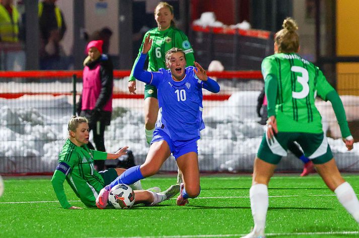 Ísland vann leikinn í kvöld 3-0 og þar með einvígi þjóðanna 5-0. Íslenska liðið verður því í skálinni þegar dregið verður í riðla A-deildar á þriðjudaginn. Sóknarmenn Íslands voru meira áberandi í kvöld því nánast ekkert reyndi á leikmenn liðsins aftar á vellinum. Ef þess þurfti þá gripu þeir þó inn í. Hér að neðan má sjá einkunnir leikmanna Íslands í kvöld. Cecilía Rán Rúnarsdóttir, markvörður [7] Greip inn í eina fyrirgjöf í fyrri hálfleik og fórnaði svo andlitinu í fót framherja Norður-Írlands til að ná til boltans eftir mistök í vörn Íslands snemma í seinni hálfleik. Gerði sem sagt sitt þegar þess þurfti en hafði bara of lítið að gera til að fá hærri einkunn. Guðrún Arnardóttir, hægri bakvörður [6] Lét ekki mikið fyrir sér fara en átti aldrei í vandræðum með varnarleikinn og spilaði einfalt. Tók stundum lengri hlaup fram en oftast áður og var afar nálægt því að skora í seinni hálfleiknum. Glódís Perla Viggósdóttir, miðvörður [6] Fór að vanda vel með boltann og hver sending hafði tilgang. Þurfti eiginlega aldrei að grípa inn í en gat látið framherja Norður-Írlands líta út eins og börn gegn fullorðnum. Tekin af velli í hálfleik enda Bayern búið að vera að passa upp á hana í haust vegna meiðsla. Ingibjörg Sigurðardóttir, miðvörður [7] Föst fyrir í hvert skipti sem á hana reyndi. Kastaði sér fyrir skot Norður-Íra seint í leiknum og sá til þess að Ísland héldi hreinu í þessu einvígi Sædís Rún Heiðarsdóttir, vinstri bakvörður [6] Hefði mátt sýna meira fram á við og nýta þennan frábæra vinstri fót. Var komin með gult spjald eftir tuttugu mínútna leik fyrir brot á miðjum vellinum en annars ekki í teljandi vandræðum. Alexandra Jóhannsdóttir, miðjumaður [6] Leikur þar sem maður hefði viljað sjá Alexöndru taka virkari þátt í spilinu fram á við, því álagið var ekki mikið varnarlega, en hún veitti fullkomið öryggi með staðsetningu sinni aftast á miðjunni. Hildur Antonsdóttir, miðjumaður [8] Afar áræðin og dugleg við að sækja í hættuleg svæði, og var einmitt á slíku svæði til að skalla boltann áfram á Hlín í öðru markinu. Lykilmaður í dag. Brotið var á Karólínu Leu Vilhjálmsdóttur í leiknum þegar Ísland fékk vítaspyrnu og úr henni kom þriðja markið.vísir/Anton Karólína Lea Vilhjálmsdóttir, miðjumaður [9] Líklegust til að hafa sent unga aðdáendur heim með stjörnur í augunum. Virkaði mjög fersk og lék oft skemmtilega á gestina. Tengdi vel saman við Sveindísi og var nálægt því að skora með góðu skoti snemma leiks. Hélt áfram að skapa fyrir samherja sína út leikinn og fiskaði víti með frábærum hætti. Hlín Eiríksdóttir, hægri vængmaður [8] Nálægt því að leggja upp mark með frábærri fyrirgjöf á Söndru snemma leiks og gerði svo afar vel þegar hún hristi af sér varnarmann og lagði upp mark Sveindísar. Skoraði svo með fallegum skalla í seinni hálfleiknum og átti því risastóran þátt í sigrinum. Sveindís Jane Jónsdóttir, vinstri vængmaður [7] Á hárréttum stað til að koma Íslandi yfir í leiknum af stuttu færi og átti svo langa innkastið í marki tvö. Sveindís var oft í viðbót við það að skapa stórhættu en vantaði upp á lokasnertingu eða ákvörðun. Kannski samt græðgi að biðja um meira. Sandra María Jessen, sóknarmaður [5] Óstöðvandi markaskorari fyrir Köln í einni bestu deild heims en hefur ekki skorað í mótsleik fyrir Ísland í áratug, af ýmsum ástæðum. Það hefði alveg mátt breytast í kvöld og Sandra átti meðal annars skalla rétt framhjá. Varamenn:Arna Eiríksdóttir, kom inn á fyrir Glódísi á 46. mínútu [6] Virtist með smá sviðsskrekk því hún gaf Norður-Írum sitt langbesta færi með slæmri sendingu úr vörninni, ætlaða Alexöndru, en var öruggari eftir þetta og sýndi að hún getur skilað boltanum langt og vel frá sér. Arna Eiríksdóttir og Thelma Karen Pálmadóttir voru samherjar hjá FH í sumar en eru núna samherjar í íslenska landsliðinu.vísir/Anton Emilía Kiær Ásgeirsdóttir, kom inn á fyrir Söndru Maríu á 65. mínútu [6] Tók að sér vítaspyrnuna og skoraði af afar miklu öryggi, sitt fyrsta mark fyrir landsliðið, í tíunda leiknum. Synd að hún hafi misst af EM vegna meiðsla. Diljá Ýr Zomers, kom inn á fyrir Hlín á 65. mínútu [5] Fljót að komast í hættulegt skallafæri en annars ekki mjög áberandi. Katla Tryggvadóttir, kom inn á fyrir Hildi á 75. mínútu [5] Beinskeytt en úrslitasendingarnar gengu ekki alveg upp að þessu sinni Thelma Karen Pálmadóttir, kom inn á fyrir Sveindísi á 83. mínútu [] Sautján ára nýliði sem á eftir að láta ljós sitt skína fyrir landsliðið en spilaði ekki alveg nóg í kvöld til að fá einkunn.