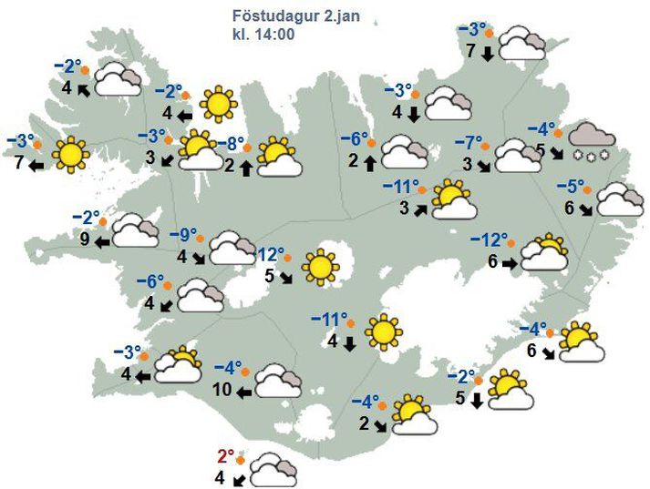 Rólegt veður en kalt næstu daga Atli Ísleifsson skrifar 2. janúar 2026 07:09 Það mun svo draga smám saman úr vindi í kvöld og nótt. Vísir/Vilhelm Veðrið verður frekar rólegt, en kalt næstu daga. Gera má ráð fyrir að það verði norðlæg átt, fimm til tíu metrar á sekúndu, og léttskýjað, en tíu til fimmtán metrar á sekúndu með dálitlum éljum á austanverðu landinu. Á vef Veðurstofunnar segir að það verði tveggja til tíu stiga frost yfir daginn og kaldast inn til landsins. Það mun svo draga smám saman úr vindi í kvöld og nótt. „Á morgun verður vestan og norðvestan 8-13 m/s með stöku éljum austantil á landinu, en annars hægari breytileg átt og yfirleitt bjart. Áfram kalt í veðri. Á sunnudag gera spár ráð fyrir hægum breytileg áttum, en vestan 5-10 nyrst. Smávægis él á víð og dreif, en yfirleitt þurrt á suðvesturhorninu. Frost 0 til 8 stig að deginum,“ segir á vef Veðurstofunnar. Spákort fyrir klukkan 14. Veðurstofan Veðurhorfur á landinu næstu daga Á laugardag: Norðlæg eða breytileg átt 3-8 m/s og léttskýjað, en norðvestan 8-13 og dálítil él á Austurlandi. Frost 2 til 12 stig, kaldast inn til landsins. Á sunnudag: Hæg breytileg átt og víða þurrt og bjart veður, en stöku él við norðurströndina. Áfram kalt í veðri. Á mánudag: Norðaustlæg átt 3-10. Skýjað á Norður- og Austurlandi og sums staðar svolítil él, en yfirleitt léttskýjað sunnan heiða. Frost 1 til 10 stig. Á þriðjudag: Austlæg átt. Skýjað með köflum og dálítil él á stöku stað, en bjartviðri sunnan- og suðvestanlands. Frost 2 til 13 stig, kaldast í innsveitum fyrir norðan. Á miðvikudag: Austlæg eða breytileg átt og víða bjartviðri. Talsvert frost um mest allt land. Á fimmtudag: Útlit fyrir austanátt með snjókomu eða slyddu, en yfirleitt þurrt á norðan- og vestanverðu landinu. Dregur úr frosti. Veður Mest lesið Vinum hans ekki litist á blikuna Innlent Segjast hafa sviðsett aftöku og hirt verðlaunaféð af Rússum Erlent Kveður klettinn í lífi sínu eftir skyndileg veikindi Innlent Pétur verið lengur en hún í stjórnmálum Innlent Tekur stóra skammta af magnýl og leiðist að hreyfa sig Erlent Fluttur á sjúkrahús eftir slys í Hrútafirði Innlent Barist á götum úti í Íran fimmta daginn í röð Erlent Veki furðu að bílaleigubílar séu ekki á nagladekkjum Innlent Fimm daga þjóðarsorg lýst yfir í Sviss Erlent Þessi fjórtán hlutu fálkaorðuna á nýársdegi Innlent Fleiri fréttir Rólegt veður en kalt næstu daga Kólnar verulega á fyrstu dögum ársins Gular viðvaranir taka gildi Hvessir þegar líður á daginn Spáin fyrir gamlárskvöld að teiknast upp Frystir norðaustantil í kvöld Væta vestantil eftir hádegi Kuldaskil á leið yfir landið Fyrstu þreifingar áramótaveðurspár Gefur lítið fyrir staðhæfingar um nýfallið hitamet Hitinn fór í 19,8 stig og desembermetið slegið Jólin verða rauð eftir allt saman Gengur í langvinnt hvassviðri seinni partinn Hiti geti mest náð átján stigum Vara við hættu á skriðuföllum og krapaflóðum Líklegt að hitamet verði slegið um jólin Appelsínugular og gular viðvaranir á aðfangadag Ákveðin suðaustanátt, milt og skúrir síðdegis Hiti að sjö stigum og mildast syðst Fer að lægja norðvestantil um hádegi Djúp lægð grefur um sig Gular viðvaranir vegna norðaustan hríðar Tíðindalítið veður en bætir í vind í kvöld Dálítil snjókoma norðantil en þurrt sunnan heiða Lægðin á undanhaldi Víða allhvass vindur og rigning Siggi stormur spáir rauðum jólum Hellidemba í kortunum og líkur á þrumum Stormur gengur yfir sunnan- og vestanvert landið Austan stormur og gular viðvaranir á morgun Sjá meira