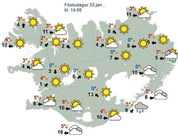 Kólnandi veður og víða bjart Atli Ísleifsson skrifar 23. janúar 2026 07:10 Hiti verður a´bilinu núll til sjö stig. Vísir/Vilhelm Veðurstofan gerir ráð fyrir strekkings austanátt með skúrum eða éljum suðaustan- og austanlands næstu daga, en bjart veður víða annars staðar. Á vef Veðurstofunnar segir að það verði kólnandi veður og frystir víða fyrir norðan, en lengst af fremur milt syðra. Hiti verður núll til sjö stig síðdegis og svalast norðaustanlands. Svipað veður á morgun, en heldur meira frost inn til landsins fyrir norðan. „Lægðir sem eru á sveimi suður í hafi ná ekki til okkar á næstunni þökk sé öflugu hæðarsvæði norður af okkur sem heldur þeim frá. Spár benda til þess að þessi staða muni ekki breytast að ráði fyrr enn í lok næstu viku,“ segir í hugleiðingum veðurfræðings. Spákort fyrir klukkan 14.Veðurstofan Veðurhorfur á landinu næstu daga Á laugardag, sunnudag og mánudag: Austanátt, víða 8-15 m/s, en 15-20 syðst. Skúrir eða él suðaustan- og austanlands, annars þurrt að mestu og víða bjart vestan- og norðantil. Hiti 0 til 7 stig, mildast sunnantil, en víða um og undir frostmarki norðantil. Á þriðjudag, miðvikudag og fimmtudag: Útlit fyrir áframhaldandi austanátt með éljum, en bjart vestanlands. Kólnandi. Veður Mest lesið Trump fer í fýlu og dregur boð sitt til Carney til baka Erlent „Þetta er svolítið óvenjulegt, ég er ekki á þingi“ Innlent Rússar, Úkraínumenn og Bandaríkjamenn funda í fyrsta sinn við sama borð Erlent Landsleikir á vinnutíma fela í sér tækifæri Innlent Játaði meira og meira eftir því sem á leið Innlent „Við getum gert það sem við viljum“ Erlent Kom ekki á teppið Innlent Foreldrarnir vissu ekki af kynferðisofbeldinu Innlent Nú geta íbúar skráð sjálfir hvað megi betur fara í borginni Innlent Fengið svör frá Bandaríkjunum um Íslandsyfirlýsingar Trumps Innlent Fleiri fréttir Kólnandi veður og víða bjart Ákveðin austanátt á landinu öllu og víða snarpar hviður Víða rigning með köflum og bætir í vind í kvöld Róleg austanátt en hvessir á morgun Víða rigning og kólnar í veðri Minnkandi norðlæg átt en bætir í vind á morgun Þurrt og bjart suðvestantil en snjór og él víða Líkur á smá slyddu og snjókomu syðst Stíf norðvestlæg átt ásamt ofankomu Gæti slegið í storm og hringvegurinn lokaður Óvissustig á vegi milli Kirkjubæjarklausturs og Jökulsárlóns Gular veðurviðvaranir framundan Útlit fyrir hríðarveður á austasta hluta landsins í kvöld Frost og hægur vindur Norðaustlæg átt og allvíða él Veginum lokað við Skaftafell og fólk leitar í fjöldahjálparstöð Vara við eldingum á Suðausturlandi Gular viðvaranir vegna norðaustan hríðar Áfram kalt á landinu Óvenjulega hlýr desember Áfram kalt og lægðir sækja að landinu Hægir vindar og snjókoma norðan- og austantil Þykknar upp og snjóar Allt að tuttugu stiga frost en bjart víða Rólegt veður en kalt næstu daga Kólnar verulega á fyrstu dögum ársins Gular viðvaranir taka gildi Hvessir þegar líður á daginn Spáin fyrir gamlárskvöld að teiknast upp Frystir norðaustantil í kvöld Sjá meira