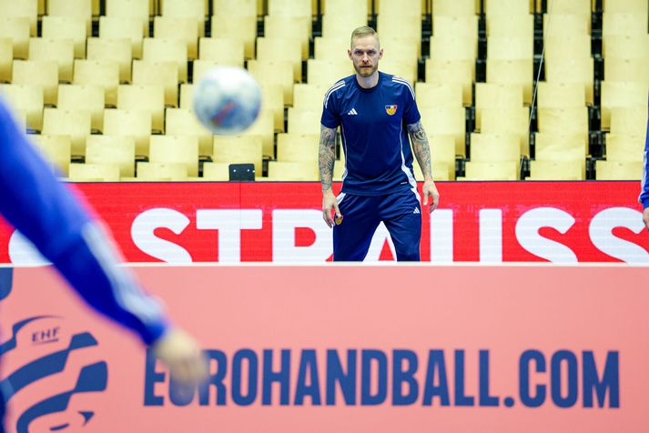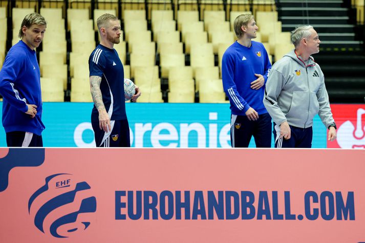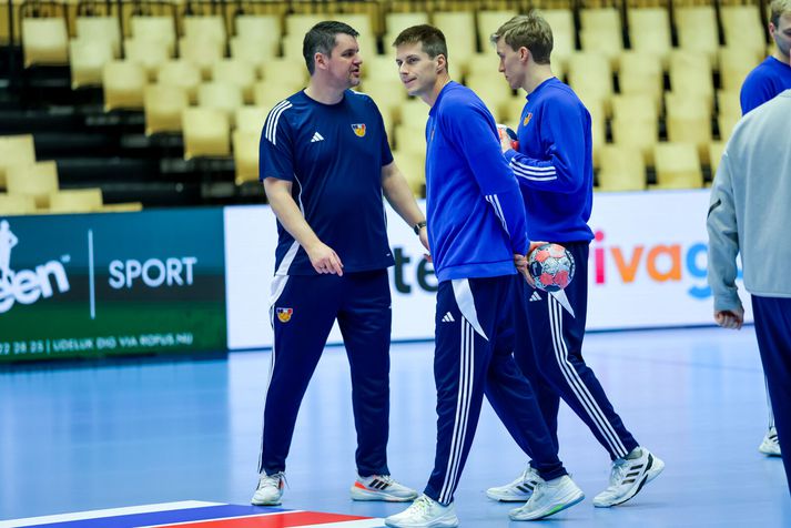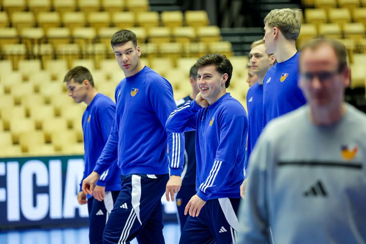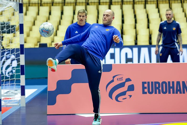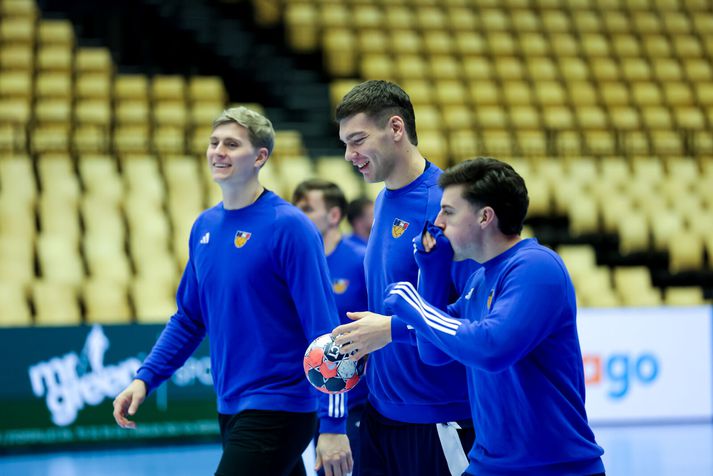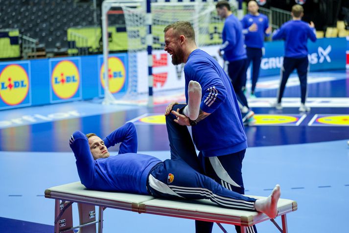 Gengið hefur á ýmsu frá því að Ísland vann Slóveníu í gær til að tryggja sæti sitt í undanúrslitum. Menn voru á bleiku skýi eftir leik í gær en í dag var ferðadagur og við tók rúmlega þriggja klukkustunda rútuferð til Herning á Jótlandi. Miðamál hafa verið mikið til umræðu en einhverjir leikmanna gátu ekki boðið þeim fjölskyldumeðlimum sem þeir vildu vegna fárra miða sem buðust frá Evrópska handknattleikssambandinu, EHF. Sambandið sætti einnig gagnrýni Dags Sigurðssonar, landsliðsþjálfara Króatíu, vegna töluvert minni hvíldartíma sem hans liði bauðst í samanburði við andstæðingana. Sama staða er uppi hjá Íslandi sem hlaut minni hvíld en Danir. Strákarnir voru þó léttir á æfingu dagsins og eftirvæntingin mikil fyrir leiknum á morgun. Enda í fyrsta sinn í 16 ár sem Ísland kemst á þetta stig. Viggó Kristjánsson og Haukur Þrastarson hituðu upp á þrekhjólum á meðan Ómar Ingi Magnússon sat á nuddbekk. Aðrir fóru í skallatennis og gleðin mikil. Vilhelm Gunnarsson, ljósmyndari Vísis, var með myndavélina á lofti á æfingunni í Herning. Björgvin Páll í skallatennis.Vísir/Vilhelm Orri Freyr ferskur.Vísir/Vilhelm Brosað hringinn í Herning.Vísir/Vilhelm Eitthvað áhugavert hefur átt sér stað hinu megin í salnum.Vísir/Vilhelm Ómar Ingi lá á nuddbekk meðan aðrir spörkuðu bolta.Vísir/Vilhelm Handboltarnir voru einnig til staðar.Vísir/Vilhelm Arnar að bjarga málunum í skallatennisnum.Vísir/Vilhelm