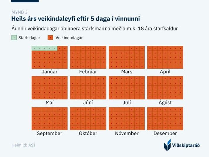 Úttekt Viðskiptaráðs birtist nú í morgun. Veikindaréttur sé réttur sem ákvarðaður sé í samningum milli atvinnurekenda og launþega og veiti launþegum rétt á launum frá vinnuveitendum vegna veikinda eða slysa. Afar misjafnt sé eftir kjarasamningum hversu ríkur veikindarétturinn sé. Þar skipti mestu máli hvort starfsmaðurinn starfi hjá hinu opinbera eða í einkageiranum. Stytting vinnuvikunnar hafi ekki fækkað veikindadögum „Eftir sex mánuði í starfi hefur opinber starfsmaður 119 daga í veikindarétt sem er sjöfaldur veikindaréttur miðað við einkageirann. Veikindaréttur opinberra starfsmanna eftir 6 mánuði er þá aðeins þremur dögum minni en veikindaréttur starfsmanna í einkageiranum eftir 5 ár í starfi,“ segir í úttektinni. Þá segir þar að fjarvera opinberra starfsmanna vegna veikinda sé tvöfalt algengari en í einkageiranum. Um sex prósent greiddra vinnustunda opinberra starfsmanna séu vegna veikindafjarvista, samanborið við 3,1 prósent í einkageiranum. Tölur frá Hagstofunni sýna að meðalfjöldi veikindadaga í einkageiranum var 8 dagar á meðan veikindadagar hjá hinu opinbera voru sextán dagar, eða tvöfalt fleiri. „Yfirlýst markmið með styttingu vinnuvikunnar var m.a. að fækka veikindadögum opinberra starfsmanna, með því að stytta vinnutíma og draga úr álagi. Staðan í Reykjavík bendir til þess að þetta markmið hafi ekki náðst þar sem fjöldi veikindadaga hefur haldist óbreyttur eftir innleiðingu styttingar vinnuvikunnar. Veikindahlutfall starfsmanna Reykjavíkurborgar nam um 7,5% árið 2024, sem jafngildir um tuttugu dögum í veikindafjarvistir á árinu.“ Umframveikindi kosti nítján milljarða á ári Þá segir í úttekt Viðskiptaráðs að þessar auknu fjarvistir vegna veikinda valdi miklum kostnaðarauka fyrir hið opinbera. Heildarlaunaútgjöld ríkis og sveitarfélaga hafi verið um 650 milljarðar árið 2024. „Út frá því má áætla að beinn árlegur kostnaður hins opinbera vegna veikinda umfram það sem gerist í einkageiranum nemi um 19 milljörðum á ári. Þar af falla til um 4,5 milljarðar hjá Reykjavíkurborg.“ Hér sé ótalinn óbeinn kostnaður vegna raskana á starfsemi, yfirvinnu annarra starfsmanna, tímabundinna ráðninga og minni framleiðni. Þegar lykilstarfsfólk sé fjarverandi skapist álag á samstarfsfólk, þjónustustig lækki og verkefnitefjistt. Umframveikindin séu því ekki aðeins kostnaðarsöm í krónum talið heldur geti þau einnig grafið undan gæðum opinberrar þjónustu. Heildaráhrifin séu því meiri en framangreind upphæð gefi til kynna. Öðlast árs veikindarétt eftir fimm daga mætingu „Opinberir starfsmenn sem náð hafa 18 ára starfsaldri þurfa einungis að mæta til vinnu í fimm daga til að öðlast veikindarétt í eitt ár. Opinber starfsmaður í þessari stöðu getur því tilkynnt um samfelld veikindaforföll fyrir utan eina viku á ári,“ segir í úttektinni. „Opinberir starfsmenn sem veikjast í orlofi teljast heldur ekki vera í orlofi þá daga sem þeir eru veikir. Til að starfsmaður í einkageiranum geti nýtt veikindadaga í orlofi þarf viðkomandi að tilkynnavinnuveitandaa sínum um veikindin á fyrsta degi þeirra, vera veikur í a.m.k. þrjá daga samfellt og vinnuveitandi hefur jafnframt rétt á að láta lækni vitja starfsmannsins.“ Segir Viðskiptaráð að lokum að það sé mat þess að ekki séu málefnaleg rök fyrir því að veikindaréttur sé ríkari hjá opinberum starfsmönnum samanborið við einkageirann. Það samrýmist illa grundvallarsjónarmiði um jafnræði að opinberir starfsmenn sitji skör hærra en starfsmenn í einkageiranum á þessu sviði. „Þessi mismunur veldur einnig skekkju í opinberri umræðu, þar sem ekki er tekið tillit til hans við samanburð á launakjörum hjá hinu opinbera og í einkageiranum. Ráðið leggur því til að veikindaréttur opinberra starfsmanna verði færður til jafns við einkageirann. Það er einnig heppilegra fyrirkomulag þegar kemu aðr langtímaveikindum. Þau geta í dag lagst þungt á fjárhag opinberra stofnana en væru þess í stað færð til viðeigandi kerfa, þ.e. örorku- og heilbrigðiskerfisins.“