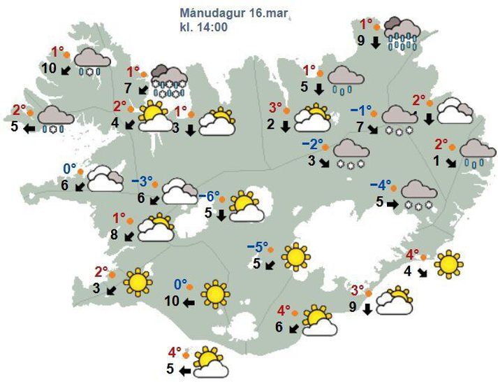Á vef Veðurstofunnar segir að í dag megi búast við norðaustanátt, víða 8 til 13 metrum á sekúndu og éljum, en léttskýjuðu á sunnanverðu landinu. Hvassviðri og snjókoma eða él norðan- og austanlands í nótt, en heldur hægari síðdegis á morgun. Hiti verður yfirleitt núll til fimm stig að deginum. „Norðanáttin ætti að ganga niður á miðvikudag, en á fimmtudag er útlit fyrir hvassa sunnanátt með talsverðri rigningu og hlýindum. Hlýja loftið ætlar þó ekki að staldra lengi við, því á föstudag og laugardag er spáð suðvestanátt með éljum og kólnandi veðri,“ segir í hugleiðingum veðurfræðings. Spákort fyrir klukkan 14 í dag.Veðurstofan Veðurhorfur á landinu næstu daga Á þriðjudag: Norðlæg átt 10-18 m/s, hvassast vestantil. Snjókoma eða él, en að mestu þurrt á Suður- og Suðvesturlandi. Hiti kringum frostmark. Á miðvikudag: Minnkandi norðvestanátt og skýjað með köflum, en dálítil él í fyrstu norðaustanlands. Vaxandi sunnanátt vestast um kvöldið og þykknar upp. Víða vægt frost. Á fimmtudag: Hvöss sunnanátt og rigning, einkum sunnan- og vestanlands. Hiti 5 til 10 stig seinnipartinn. Á föstudag og laugardag: Suðvestanátt og él, en þurrt og bjart á Austurlandi. Kólnandi veður. Á sunnudag: Útlit fyrir minnkandi suðvestlæga átt með stöku éljum, en bjartviðri um landið austanvert. Frost um mest allt land.