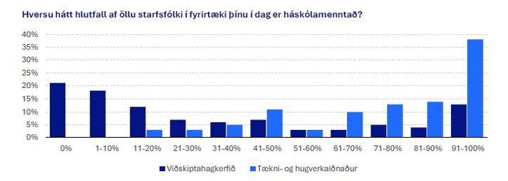 Verðmætasköpun tækni- og hugverkaiðnaðar er ríflega 440 milljarðar króna og útflutningstekjur greinarinnar 369 milljarðar króna. Útflutningstekjur þessa iðnaðar hafa vaxið hratt á síðustu árum og áttfaldast frá árinu 2008. Á síðasta ári voru útflutningstekjur tækni- og hugverkaiðnaðar í fyrsta sinn hærri en útflutningstekjur sjávarútvegs, eða um 19 prósent af heildarútflutningstekjum Íslands. Þetta kemur fram í nýrri greiningu Samtaka iðnaðarins, SI, á stöðu tækni- og hugverkaiðnaðar. Útflutningstekjur tækni- og hugverkaiðnaðar frá 2008 til 2024. SI Velta greinarinnar nam nær 700 milljörðum króna sem er tæplega 10 prósent af veltu viðskiptahagkerfisins. Um helmingur af veltu greinarinnar eru útflutningstekjur. Í greininni störfuðu í fyrra ríflega 18 þúsund manns. Skattspor greinarinnar var 186 milljarðar króna árið 2024. Í greiningu SI segir að raunverulegt umfang tækni- og hugverkaiðnaðar sé þó meira en ofangreindar tölur segja til um. Virðiskeðja greinarinnar teygi anga sína langt út fyrir hina eiginlegu starfsemi fyrirtækjanna sem starfa í greininni. Þau kaupi fjölbreytt aðföng og þjónustu af ótal aðilum úr öðrum geirum atvinnulífsins. Ávinningurinn af starfsemi greinarinnar margfaldist þannig. Mörg verðmætustu fyrirtækin innan greinarinnar Undir greinina falla meðal annars fyrirtæki í upplýsingatækni, gagnaversiðnaði og fjarskiptum, tölvuleikjagerð, auk lyfjaframleiðslu, líf- og heilbrigðistækni og annars hátækniiðnaðar. Vöxtur tækni- og hugverkaiðnaðar á síðustu árum hefur aukið fjölbreytni í útflutningi og þannig rennt stoðum undir aukinn stöðugleika í hagkerfinu. Mörg verðmætustu fyrirtækin í íslensku Kauphöllinni eru fyrirtæki innan þessarar greinar. Þar má nefna JBT Marel og Alvotech, sem hafa verið byggð frá grunni á Íslandi, auk annarra öflugra fyrirtækja með rætur hér á landi eins og Emblu Medical, Kerecis, Nox Medical og CCP. Í greiningunni kemur fram að fjárfesting í rannsóknum og þróun (R&Þ) sé undirstaða tækni- og hugverkaiðnaðar. Hugvit og sérhæfður mannauður séu helstu auðlindir greinarinnar. Þannig hafi um 96 prósent af skattahvötum vegna rannsókna og þróunar farið til fyrirtækja í tækni- og hugverkaiðnaði. Skattahvatar í rannsóknum og þróun séu öflugasta tólið í verkfærakistu ríkisins til að stuðla að vexti tækni- og hugverkaiðnaðar og hafi leitt til þess að fyrirtæki í greininni hafa sett aukið fjármagn í rannsóknir og þróun, háframleiðnistörfum hefur fjölgað og útflutningur hefur aukist. Þá kemur fram í greiningunni að fjárfestingar í rannsóknum og þróun hafi aukist mikið á Íslandi á síðustu árum og að þær séu nú, sem hlutfall af landsframleiðslu, yfir meðaltali ESB-ríkja en hins vegar lægri en í Bandaríkjunum. Auknar fjárfestingar í R&Þ sem hlutfall af landsframleiðslu hér á landi á síðustu árum megi helst rekja til þess að fyrirtæki hafa aukið við sitt framlag. Hlutfall fyrirtækja í heildarfjárfestingum í R&Þ hafi þannig aldrei verið hærra frá því að Hagstofa Íslands hóf mælingar á þessum þætti árið 2014. Það nemur nú 75 prósentum af heildarfjárfestingu í R&Þ. Þetta hlutfall er hærra en í ríkjum ESB að jafnaði, en þar er það 67 prósent þótt það sé lægra en í Bandaríkjunum þar sem það er 78 prósent. Skattahvatar verði festir í sessi Í greiningu SI segir að samtökin hafi lagt áherslu á að skattahvatar vegna R&Þ verði festir í sessi og að fyrirkomulagið verði fyrirsjáanlegt. Þannig skapist hvati til aukinna fjárfestinga og geta fyrirtækja til að gera áætlanir til langs tíma. Í greiningunni segir að fyrirtækin í iðnaðinum byggi starfsemi sína að stórum hluta á sérfræðimenntuðu starfsfólki, sérstaklega í STEAM-greinum sem eru vísindi, tækni, verkfræði, listir og stærðfræði. Hlutfall háskólamenntaðs starfsfólks sé mun hærra í greininni en í hagkerfinu almennt. Stjórnendur voru spurðir um háskólamenntun starfsfólks síns. SI Í könnun sem Gallup gerði meðal stjórnenda fyrirtækja í byrjun þessa árs komi til dæmis fram að í 68 prósent fyrirtækja í tækni- og hugverkaiðnaði sé hlutfall háskólamenntaðra 70 prósent eða hærra. Til samanburðar eru einungis 22 prósent fyrirtækja í viðskiptahagkerfinu með svo hátt hlutfall háskólamenntaðra. Í sömu könnun komi fram að þriðjungur stjórnenda telji skort á starfsfólki og helst skorti háskólamenntaða sérfræðinga. Þá kom einnig fram að væntingar um fjölgun starfsmanna hafi verið mestar meðal stjórnenda í tækni- og hugverkaiðnaði en um 35 prósent töldu að skortur á mannauði myndi standa í vegi fyrir vexti fyrirtækja þeirra næstu fimm árin. Þá var einnig í könnunni fjallað um það íslenskt menntakerfi hafi ekki getað mætt þessari þörf og segir í greiningu SI að það undirstriki mikilvægi þess að aðgengi að erlendum sérfræðimenntuðum mannauði sé gott, jafnframt því sem innlent menntakerfi sé eflt á þessu sviði. Að lokum er í greiningunni farið yfir skattspor fyrirtækja í þessum iðnaði. Þar segir að á árinu 2024 hafi heildarskattspor tækni- og hugverkaiðnaðarins numið 186 milljörðum króna og þröngt skattspor 93 milljörðum króna. Skattspor greinarinnar hafi stækkað á milli ára, en árið 2023 nam heildarskattspor greinarinnar 176 milljörðum króna og þröngt skilgreint skattspor 82 milljörðum króna á verðlagi árs 2024. Þá segir að skattspor greinarinnar sé stórt í samanburði við aðrar útflutningsgreinar, en til samanburðar hafi vítt skilgreint skattspor ferðaþjónustunnar numið 190 milljörðum króna og þröngt skilgreint skattspor hennar 108 milljörðum króna árið 2024. Þröngt skilgreint skattspor fiskveið
