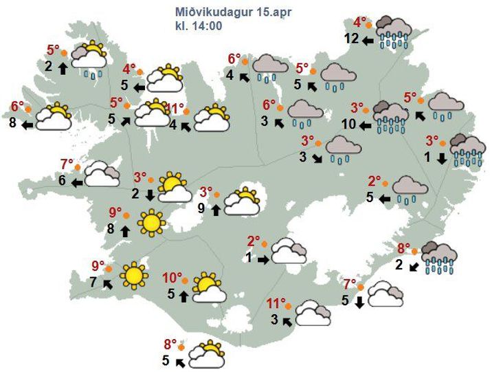 Á vef Veðurstofunnar segir að hitinn verði þrjú til tíu stig að deginum, svalast á Norðausturlandi. „Á morgun er útlit fyrir hægviðri um allt land. Þungbúið og dálítil súld norðaustan- og austanlands. Skýjað með köflum í öðrum landshlutum og sums staðar lítilsháttar skúrir. Hiti 3 til 10 stig að deginum, svalast á Norðausturlandi. Áfram er útlit fyrir hæglætisveður á föstudaginn. Smávegis skúrir á Suður- og Vesturlandi, en það ætti að vera þurrt í öðrum landshlutum. Hitinn þokast aðeins niður á við,“ segir á vef Veðurstofunnar. Spákort fyrir klukkan 14 í dag.Veðurstofan Veðurhorfur á landinu næstu daga Á fimmtudag: Hæg breytileg átt. Dálítil væta með köflum, en yfirleitt þurrt á norðvestanverðu landinu. Hiti 4 til 10 stig að deginum. Á föstudag: Fremur hæg suðlæg átt og smáskúrir, en yfirleitt léttskýjað á Norður- og Austurlandi. Hiti breytist lítið. Á laugardag: Norðvestan 5-13 m/s, hvassast við austurströndina. Þurrt að kalla sunnan- og vestanlands. Rigning eða slydda annars staðar, en víða úrkomulaust um kvöldið. Heldur kólnandi. Á sunnudag: Suðlæg átt og lítilsháttar væta á Suður- og Vesturlandi, en bjartviðri fyrir norðan og austan. Hiti 2 til 8 stig. Á mánudag: Sunnanátt með rigningu eða slyddu, en þurrt um landið norðaustanvert. Hiti 1 til 7 stig. Á þriðjudag: Vestlæg átt og bjartviðri, en skýjað vestanlands. Hlýnandi veður.