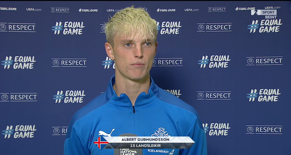 Arnar Gunnlaugsson ræddi byrjunarlið Íslands gegn Aserbaísjan við Val Pál Eiríksson og Kjartan Henry Finnbogason á keppnisvellinum í Bakú. Jóhann Berg byrjar sinn 100. landsleik.