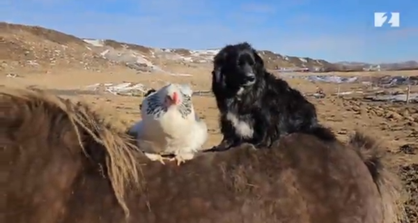 Hundur og hæna saman á hestbaki